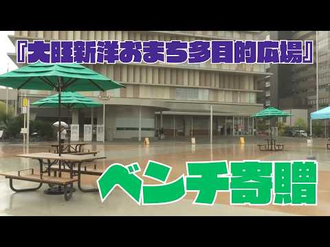 高知市 オーテピア西側の「大旺新洋おまち多目的広場」にライオンズクラブからパラソル付きテーブルベンチが贈られた。